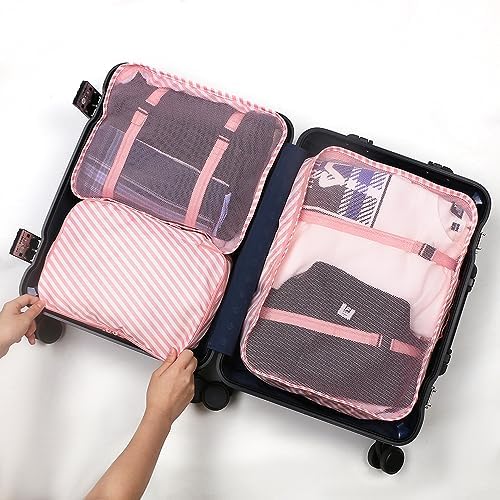 This set includes 3 travel packing cubes with clear mesh top, 1 personal cube for bras and underwear, 1 travel shoe bag, 1 cosmetic bag, 1 dirty laundry bag and 1 flat bag for small items such as socks, electronic accessories or keys.
