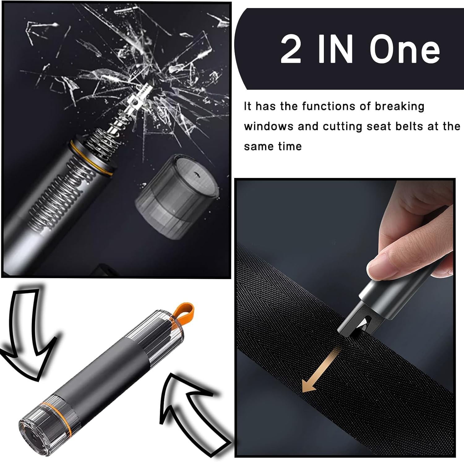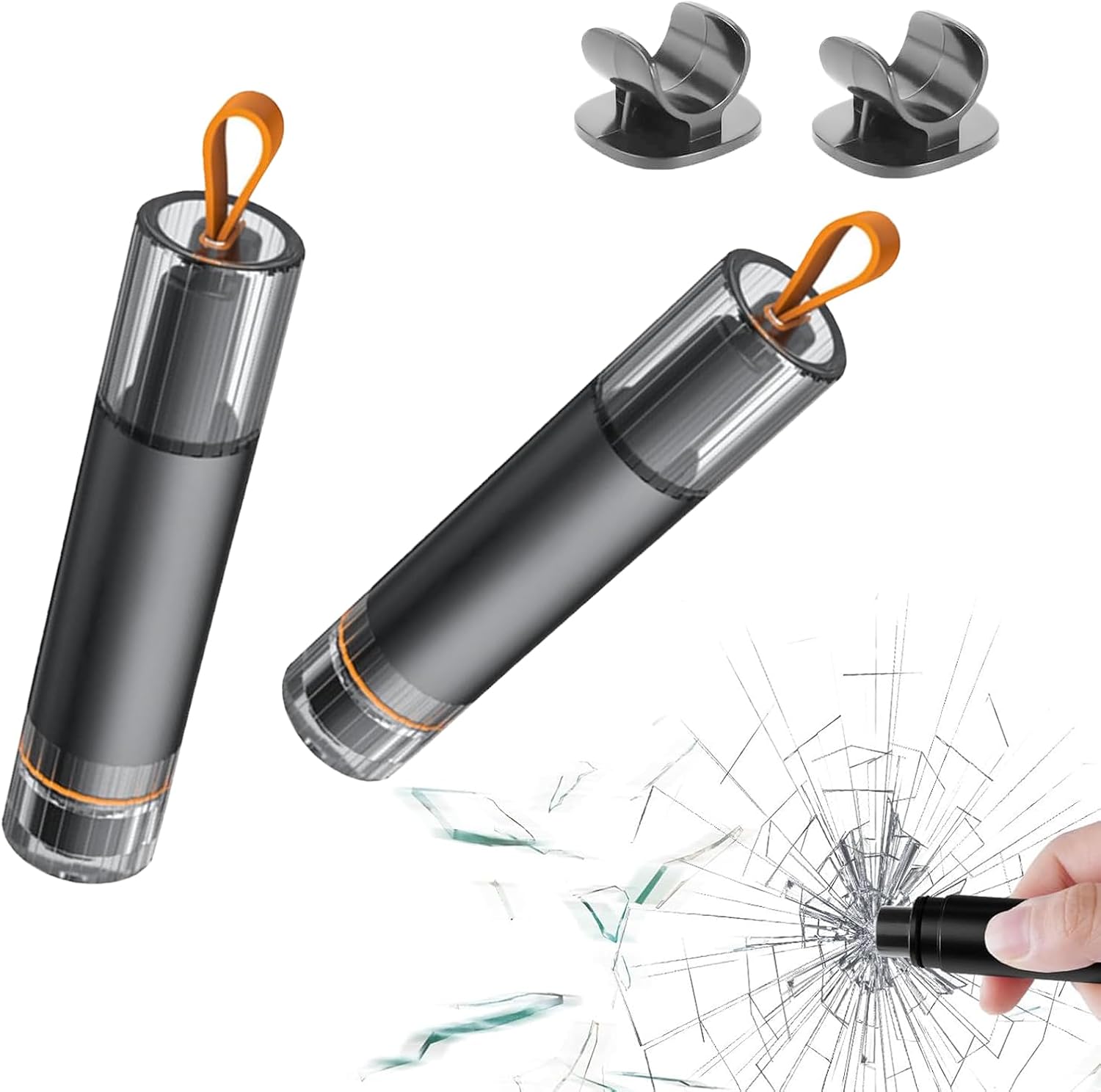 Emergency hammer with seat belt cutter: our car hammer with seat belt cutter is a 2-in-1 emergency tool that serves as both a hammer for breaking car windows and as a seat belt cutter for cutting seat belts. The tungsten steel hammer head allows window panes to be destroyed quickly and effectively, while the integrated belt cutter can be life-saving in an emergency