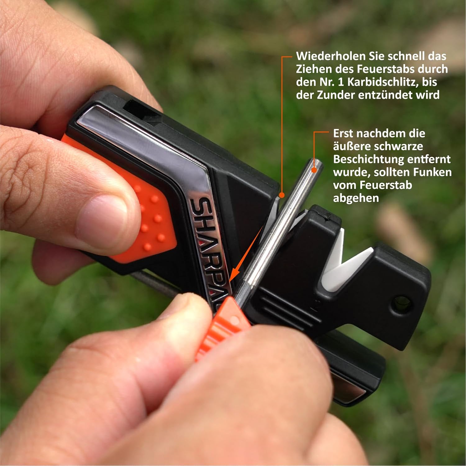 4. Hold the sharpener by the soft rubber handle in the left hand and lean it over the tinder. Fully insert the fire stick into the slot no. 1 CARBIDE and quickly pull the fire stick through the slot with moderate pressure down towards the indicator arrows. Sparks should detach from the fire stick when it scratches over the crossed carbide blades and falls on the tinder that ignites it.