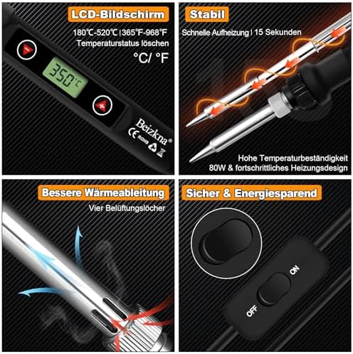 5℃ Adjustable Temperature: Accurately adjust temperature from 180°C to 520°C (356°-968°℉) with +/- buttons.(More precise setting than 50°C)20s Fast Heating: Allow you to work faster.LCD Screen Display: Accurate temperature readings to protect your welding objectON/OFF Switch: Easily save energy and keep welding safe.23g Rosin Core Solder Wire: Easy to solder, fluent, fast soldering and strong soldering point.5 high-quality soldering iron tips: Coated with iron and nickel, which are anti-oxidized to ensure long service life.Heat Resistant Non-Slip Grip: Safer for long time useFast heat dissipation soldering pins: four ventilation holes, fast heat dissipation timeAll-aluminum alloy desoldering pump: for removing solder residue when desoldering electronic componentsPU Bags: Portable and easy to organize.