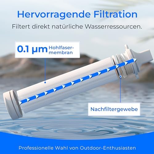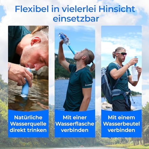 Recyclable straw: With innovative backwash cleaning function, the inside of the water filter straw can be kept clean at all times and it is recyclable, safe and non-toxic. If the water flow decreases or the filter has been used for a long time, you can remove the mouthpiece, rinse it with clean water. (Standard water bag can be used or pop bottle with thread diameter of 27.5mm can be filled with clean water to backwash the filter straw.)