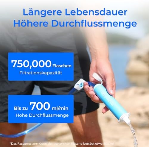 Longer service life: the Waterdrop filter straw can provide safe drinking water up to 5,300 litres, and ensures the maximum water flow rate of up to 700 ml/min to provide a more relaxed outdoor water drinking experience.