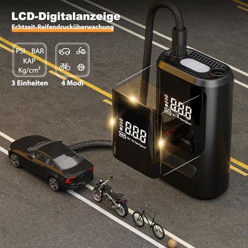 4 air pressure modes and digital screen: ZORUMAN battery air pump can measure the tyre pressure when it is inserted into the tyre, inflate and reach the set pressure and then automatically stop to keep you and your vehicle in a safe condition. The compressor battery also has 4 levels of PSI, BAR, KPA, kg/cm to choose from.
